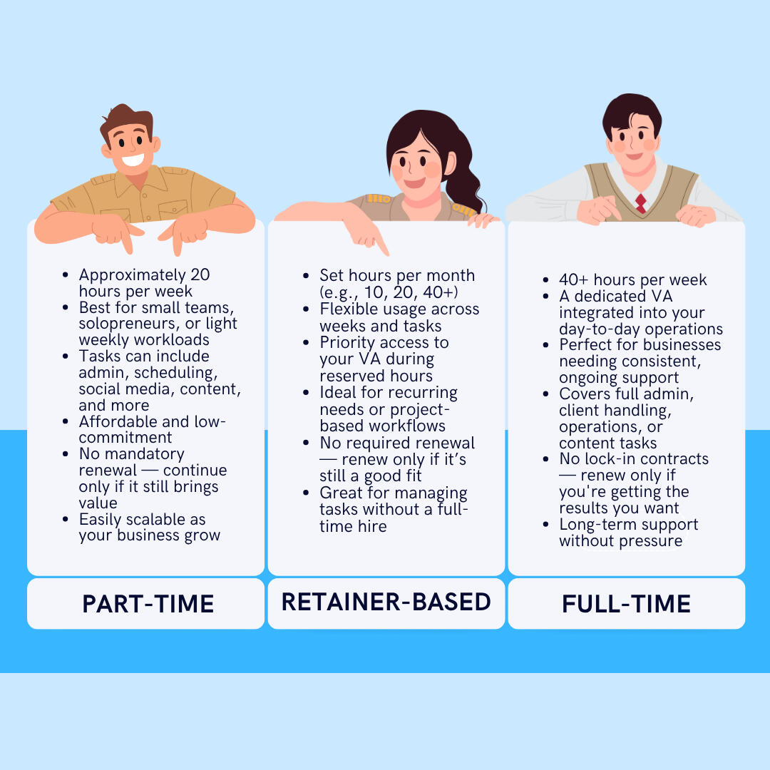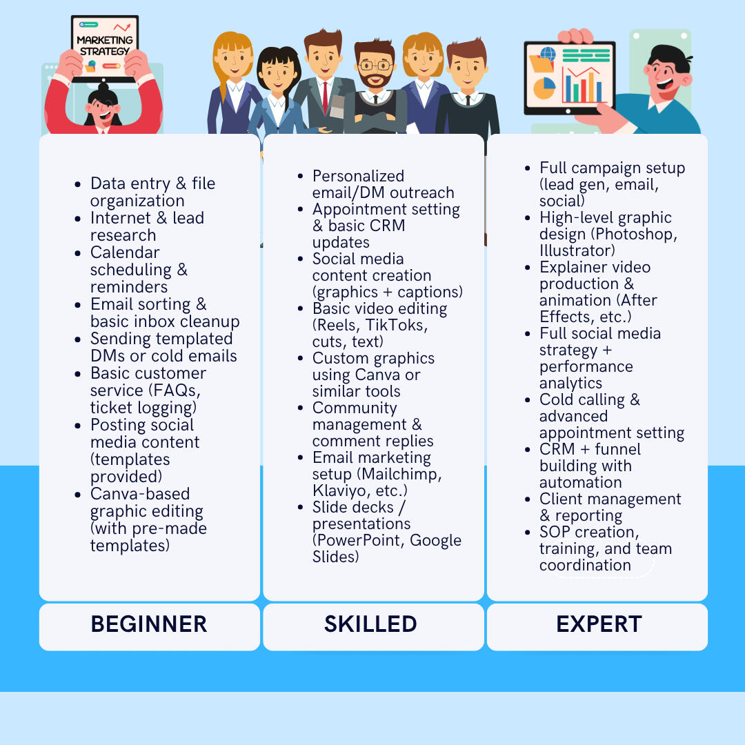 We offer flexible, skill-based virtual assistant services at three affordable levels — Beginner, Skilled, and Expert.Whether you need help with simple admin tasks, creative content creation, or managing full-scale marketing campaigns, we match you with the right talent at the right price.Need to scale up or down? No problem. Our setup is designed to grow with your business, so you can adjust your support level anytime.